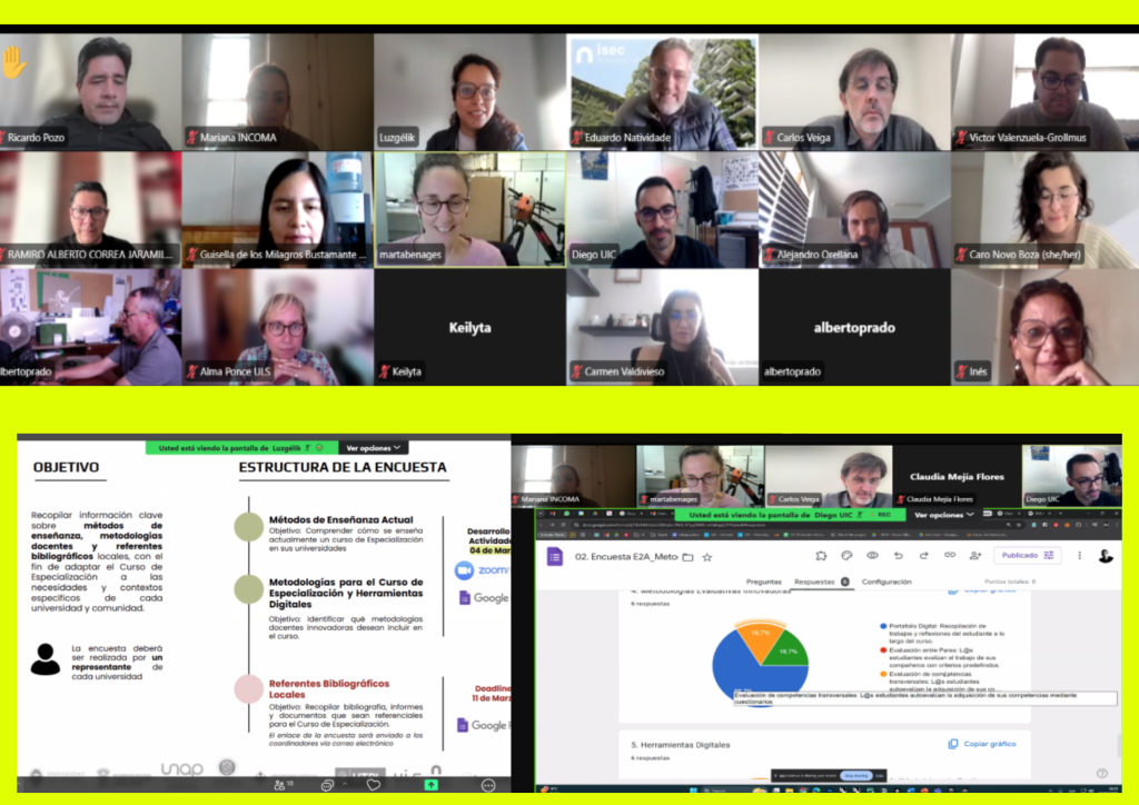 Na primeira fase, foram realizados dois workshops para identificar os desafios e oportunidades específicos de cada país nessa área. Com uma base sólida, nesta nova sessão as universidades participantes compartilharam suas experiências, métodos de ensino atuais e as metodologias de ensino mais utilizadas em cursos de especialização por meio de pesquisas. Essas trocas enriqueceram o processo e forneceram ideias fundamentais para a estruturação do curso.